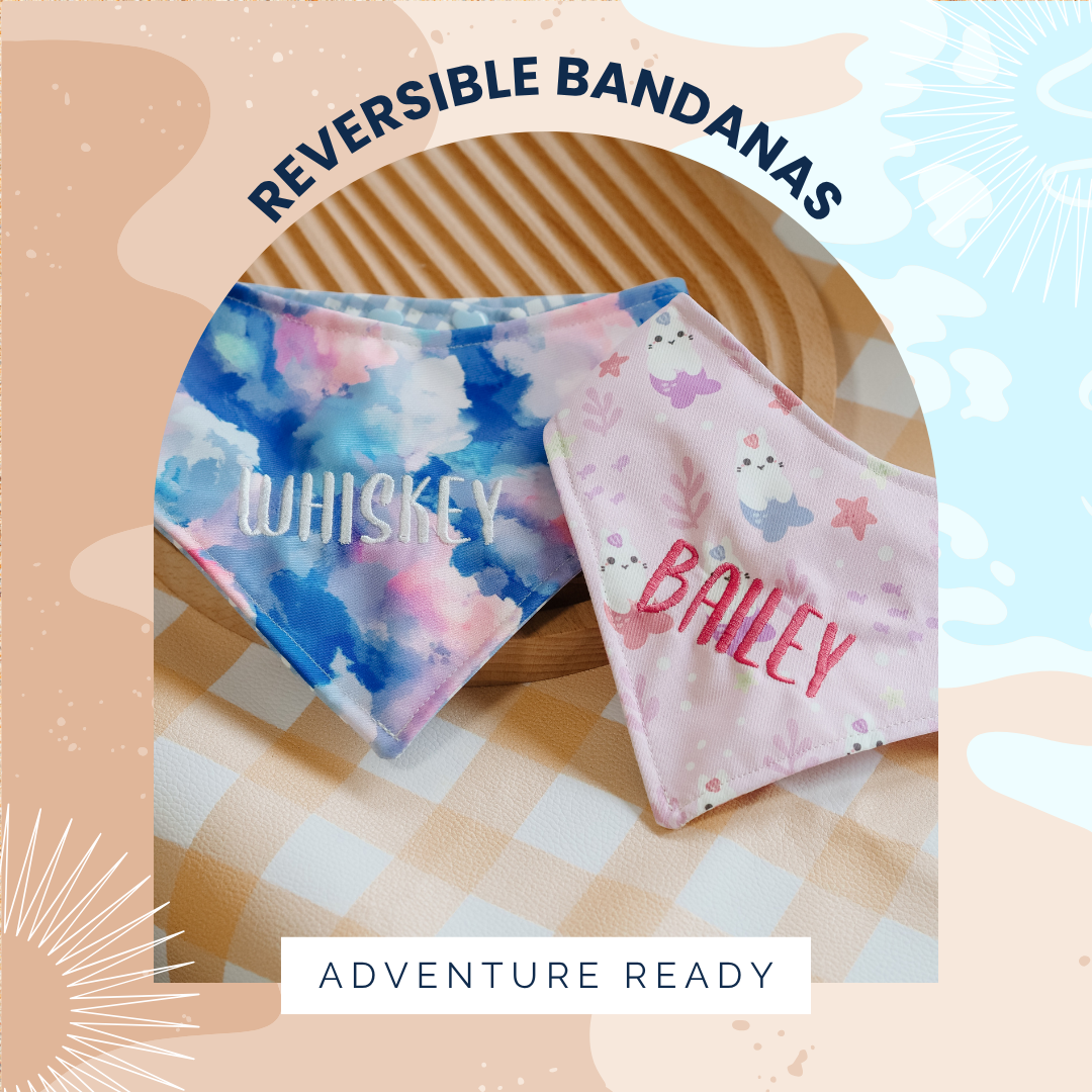 Select two prints and personalise your furbaby bandana with their name. You can even choose your own font design & color!