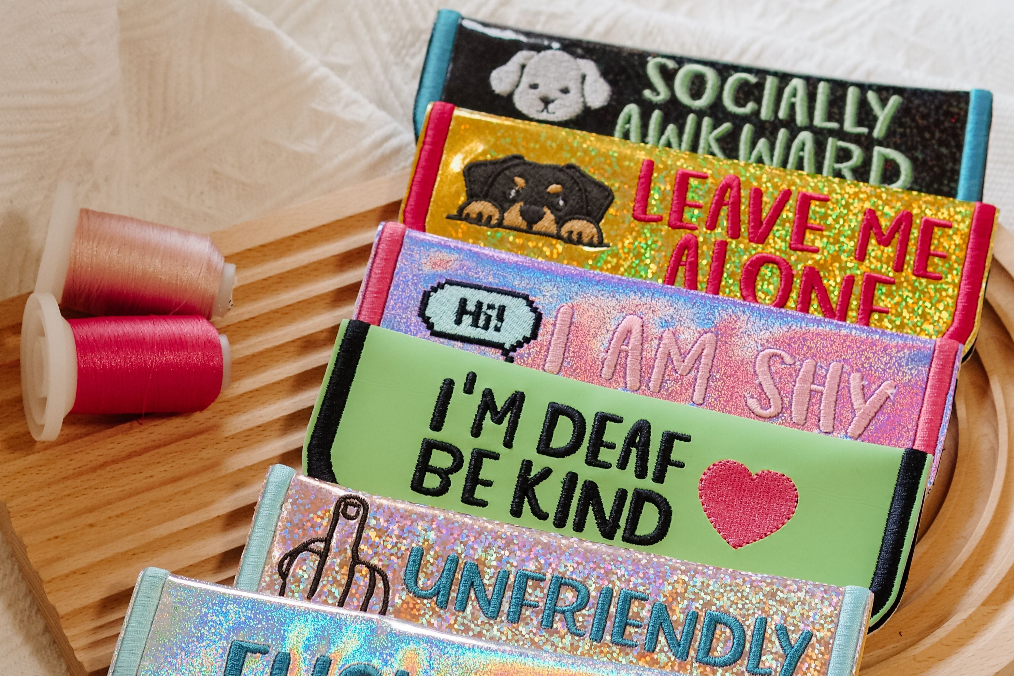 Handmade message tags (leash sleeves), sewn in Singapore. Part of our Yellow...